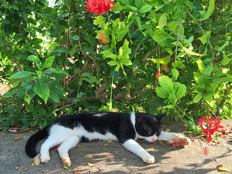 伊江島ダイビングサービスのネコも、風鈴仏桑華(学名:Hibiscus schizopetalus 英名:Coral hibiscus コーラルハイビスカス)の下でお昼寝です。