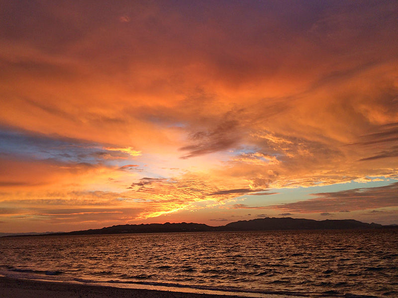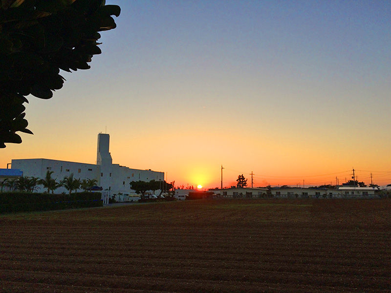 そして夕方に外を見たら、YYYクラブイエリゾートの方に夕日がまさしく沈むところ。